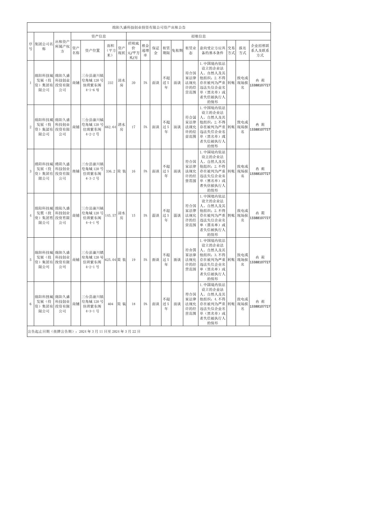 綿陽久盛科技創(chuàng)業(yè)投資有限公司資產(chǎn)出租公告