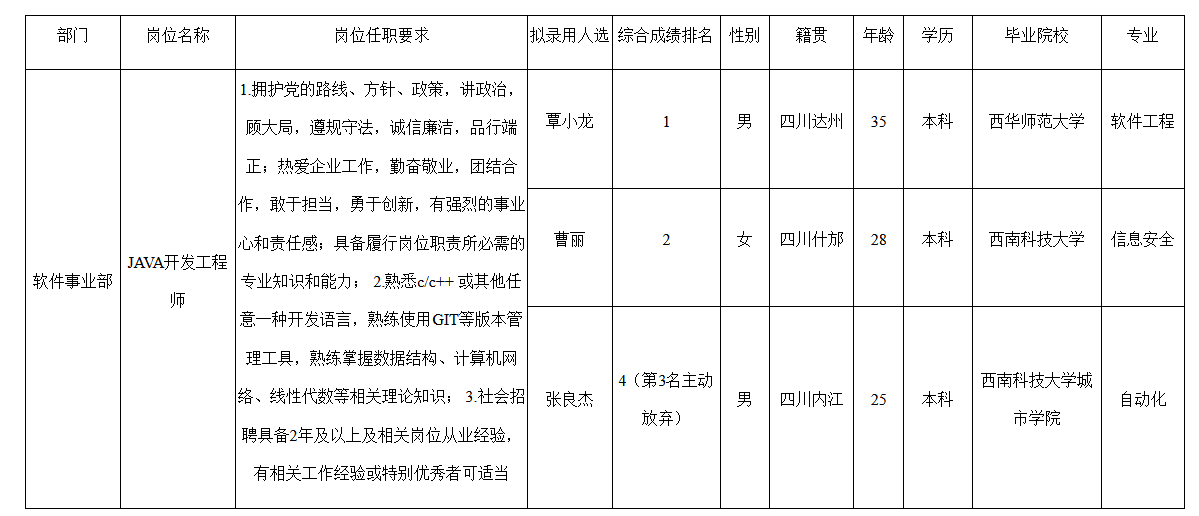 根據(jù)四川九強通信科技有限公司發(fā)布的招聘公告及招聘相關(guān)規(guī)定,經(jīng)筆試、面試、考察、體檢等程序,擬錄用覃小龍,曹麗,張良杰同志到四川九強通信科技有限公司工作,現(xiàn)予以公示,具體情況如下: