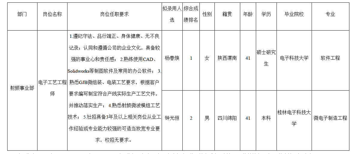 根據(jù)四川九強(qiáng)通信科技有限公司發(fā)布的招聘公告及招聘相關(guān)規(guī)定,經(jīng)筆試、面試、考察、體檢等程序,擬錄用楊春煥,鐘光恒同志到四川九強(qiáng)通信科技有限公司工作,現(xiàn)予以公示,具體情況如下: