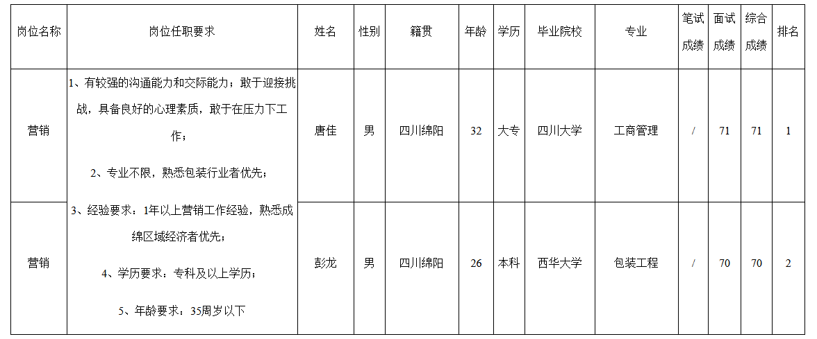 根據(jù)四川長虹包裝印務有限公司發(fā)布的招聘公告及招聘相關(guān)規(guī)定,經(jīng)筆試、面試等程序,現(xiàn)將筆試(面試)成績予以公示。