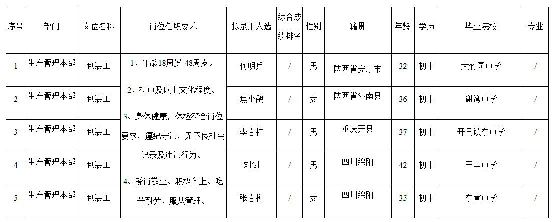 根據(jù)四川長(zhǎng)虹新能源科技股份有限公司發(fā)布的招聘公告及招聘相關(guān)規(guī)定,經(jīng)面試、體檢等程序,擬錄用何明兵等5名同志到四川長(zhǎng)虹新能源科技股份有限公司工作,現(xiàn)予以公示,具體情況如下: