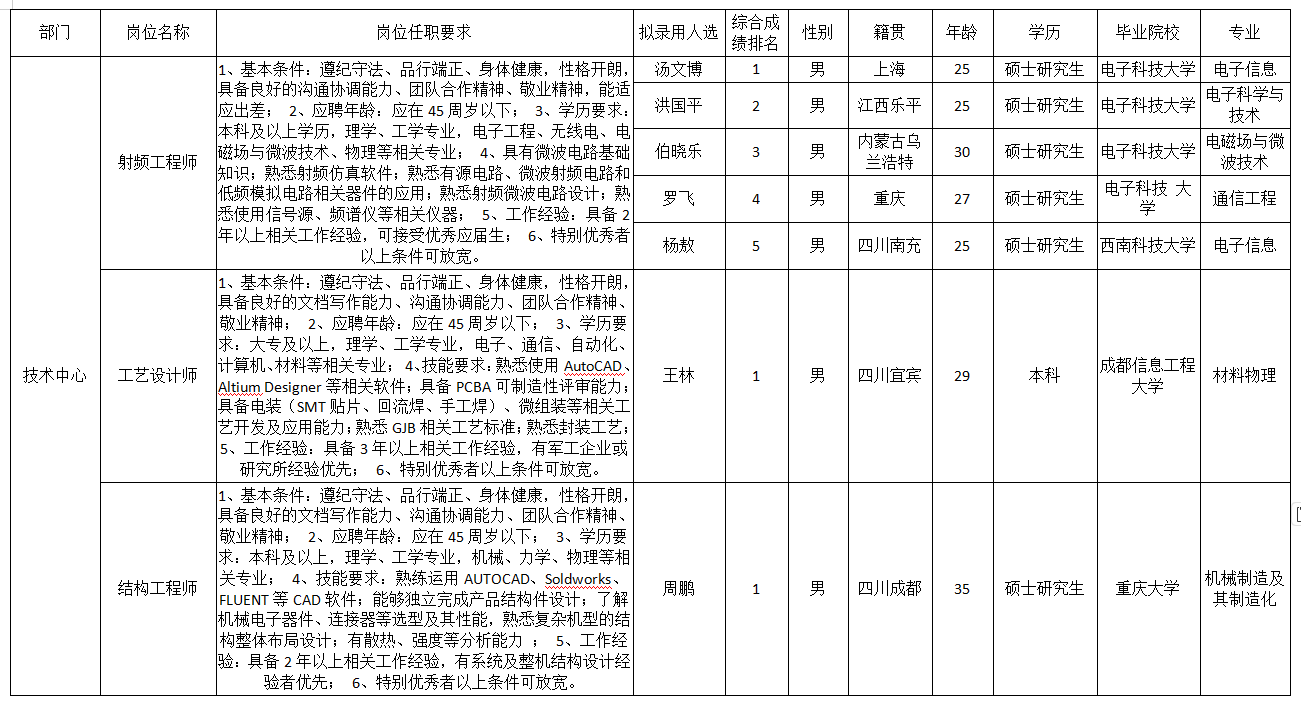 根據(jù)成都九洲迪飛科技有限責任公司發(fā)布的招聘公告及招聘相關規(guī)定,經(jīng)筆試、面試、考察、體檢等程序,擬錄用湯文博等同志到成都九洲迪飛科技有限責任公司工作,現(xiàn)予以公示,具體情況如下: