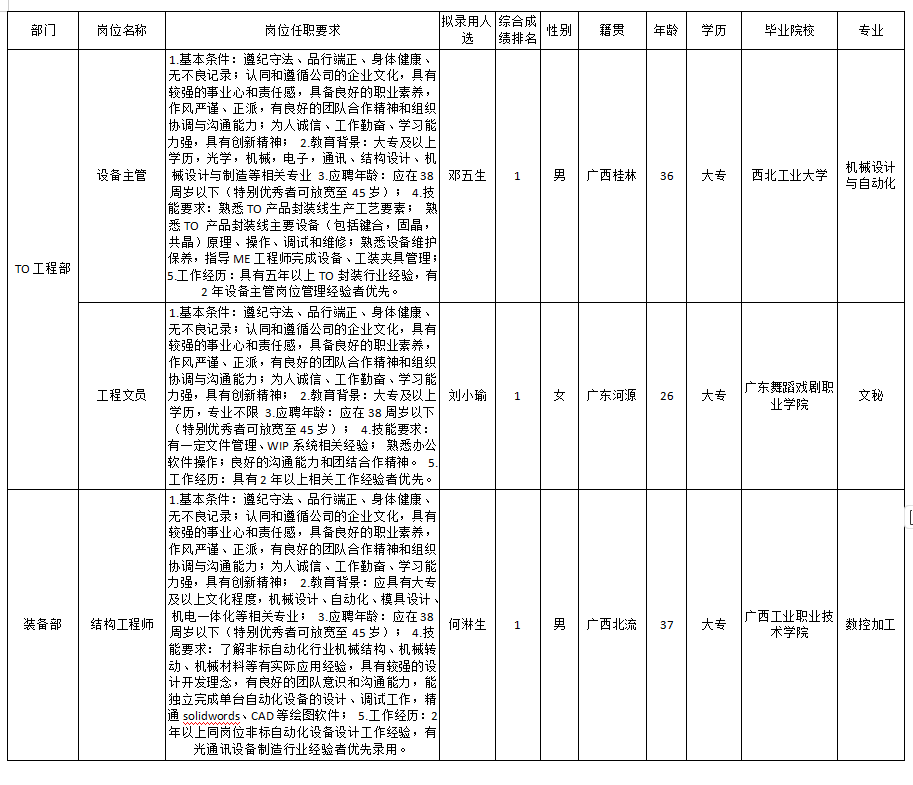 根據(jù)深圳九州光電子技術(shù)有限公司發(fā)布的招聘公告及招聘相關(guān)規(guī)定,經(jīng)筆試、面試、考察、體檢等程序,擬錄用何淋生,鄧五生,劉小瑜同志到深圳九州光電子技術(shù)有限公司工作,現(xiàn)予以公示,具體情況如下: