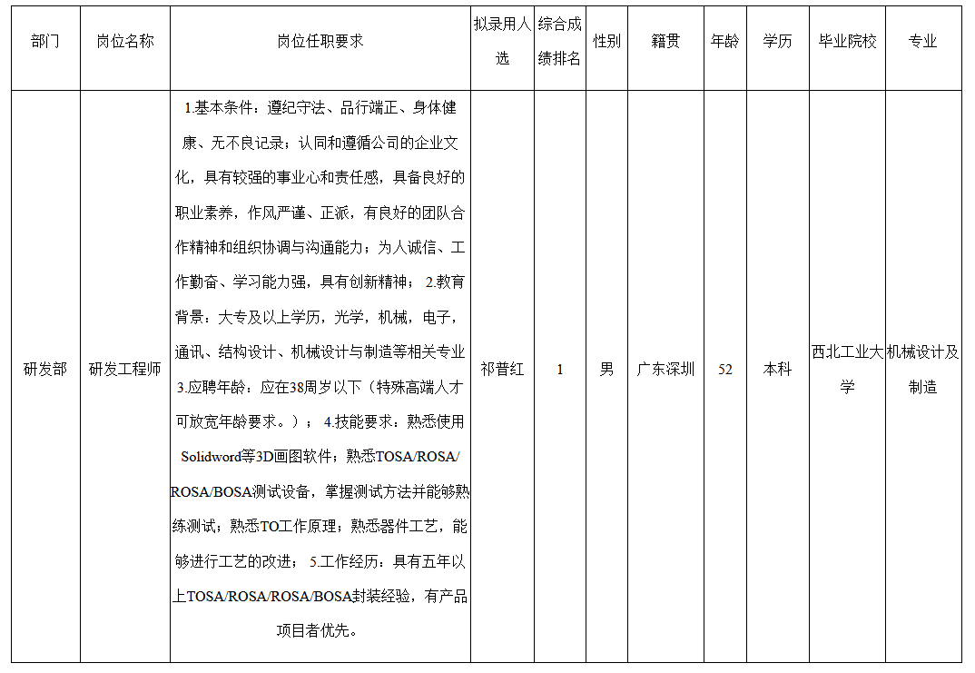 根據深圳九州光電子技術有限公司發(fā)布的招聘公告及招聘相關規(guī)定,經筆試、面試、考察、體檢等程序,擬錄用祁普紅同志到深圳九州光電子技術有限公司工作,現予以公示,具體情況如下: