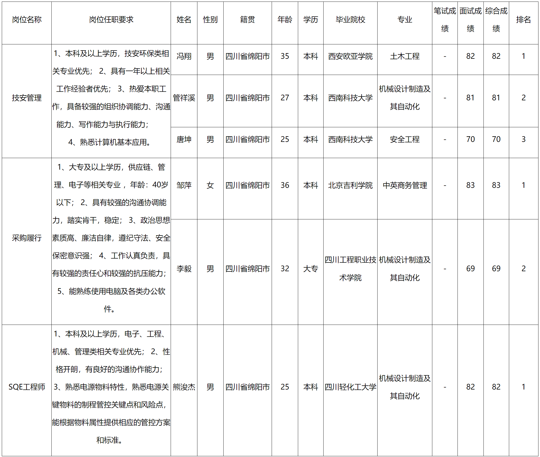 根據(jù)四川九州電子科技股份有限公司發(fā)布的招聘公告及招聘相關(guān)規(guī)定,經(jīng)筆試、面試等程序,現(xiàn)將筆試(面試)成績(jī)予以公示。