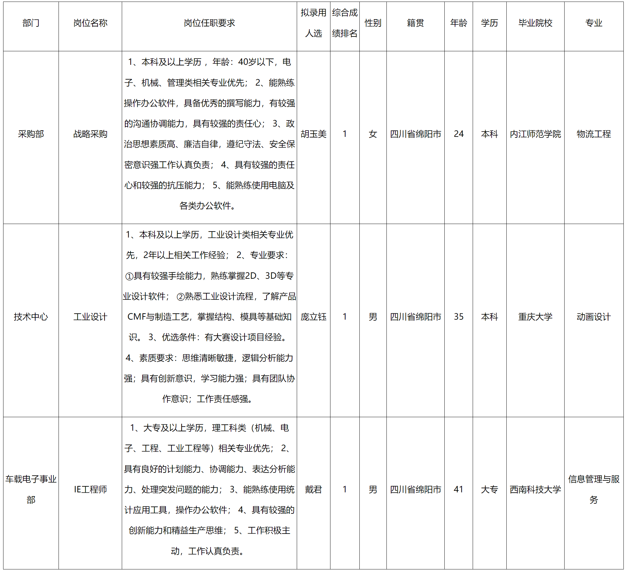 根據(jù)四川九州電子科技股份有限公司發(fā)布的招聘公告及招聘相關(guān)規(guī)定,經(jīng)筆試、面試、考察、體檢等程序,擬錄用龐立鈺,戴君,胡玉美同志到四川九州電子科技股份有限公司工作,現(xiàn)予以公示,具體情況如下: