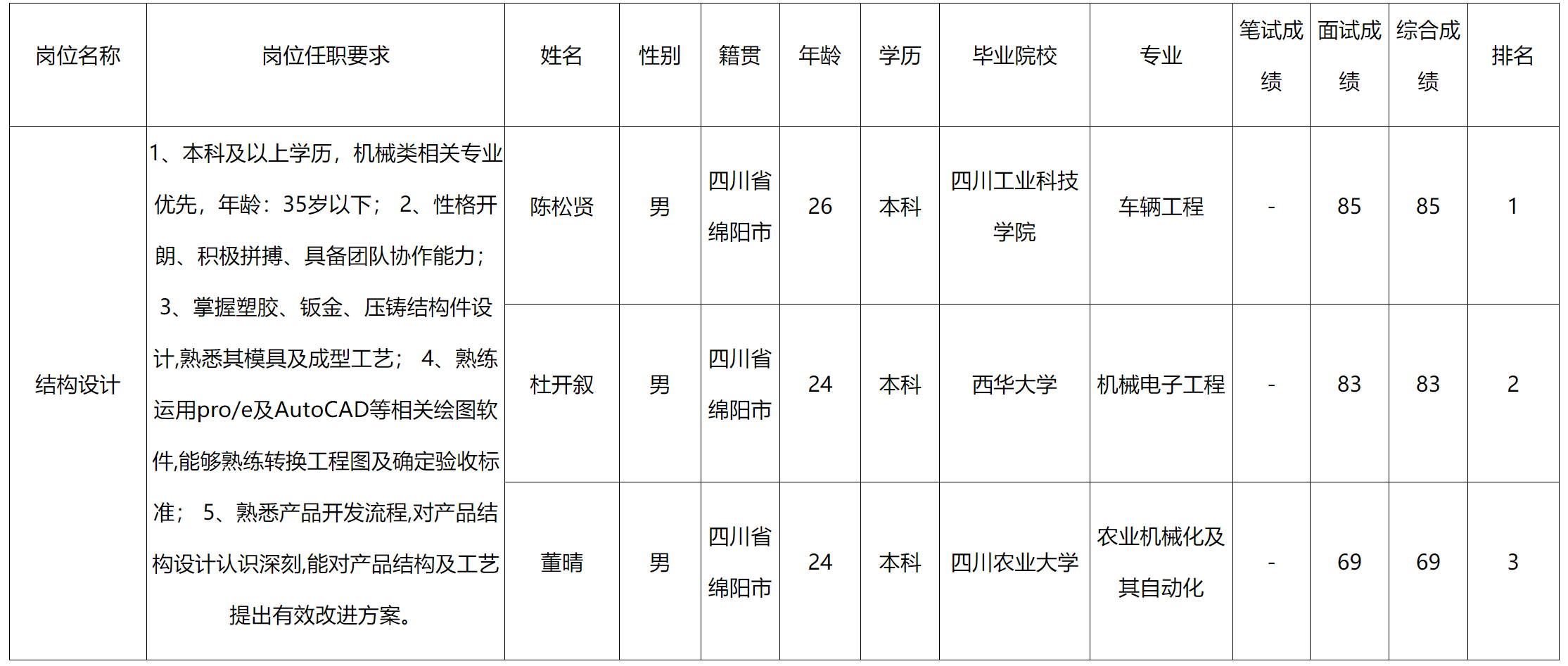 根據(jù)四川九州電子科技股份有限公司發(fā)布的招聘公告及招聘相關(guān)規(guī)定,經(jīng)筆試、面試等程序,現(xiàn)將筆試(面試)成績予以公示。