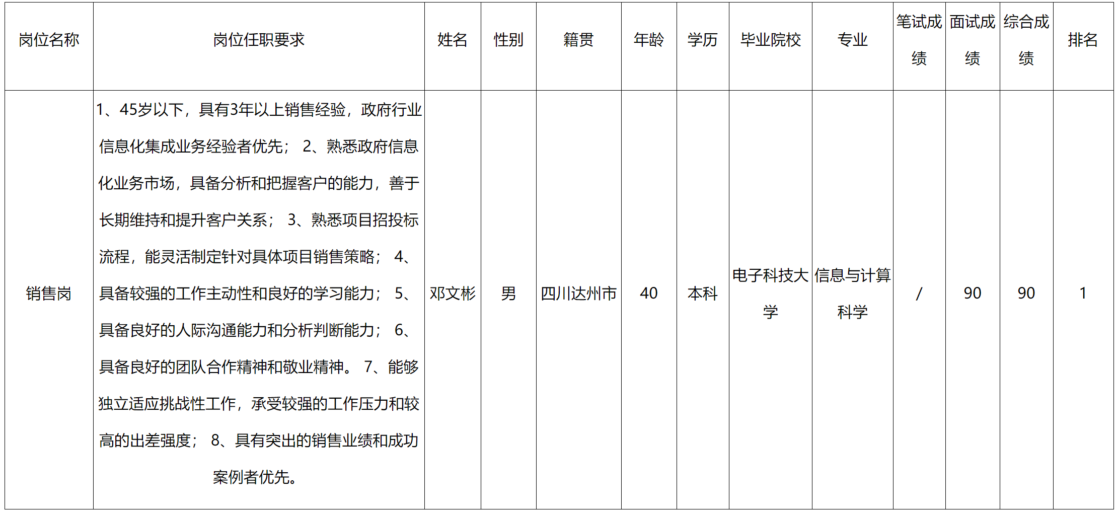 根據(jù)四川九州北斗導(dǎo)航與位置服務(wù)有限公司發(fā)布的招聘公告及招聘相關(guān)規(guī)定,經(jīng)筆試、面試等程序,現(xiàn)將筆試(面試)成績予以公示。