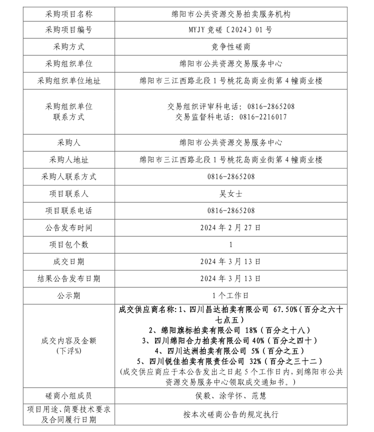 關(guān)于“綿陽(yáng)市公共資源交易拍賣(mài)服務(wù)機(jī)構(gòu)”項(xiàng)目采購(gòu)結(jié)果的公告