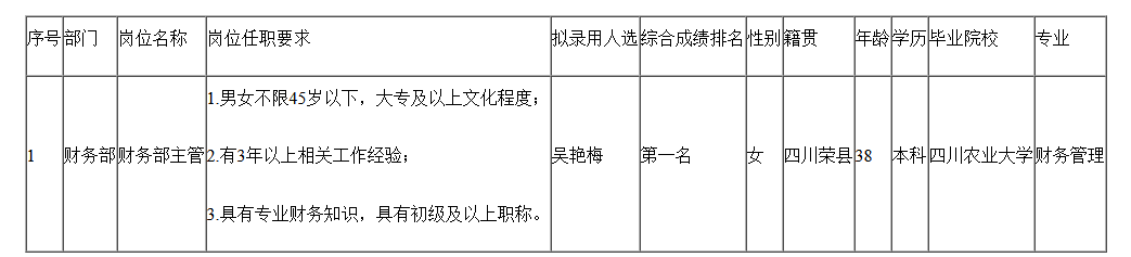 根據(jù)綿陽市綿州嘉來會務(wù)服務(wù)有限公司發(fā)布的招聘公告及招聘相關(guān)規(guī)定,經(jīng)筆試、面試、背景調(diào)查、體檢等程序,擬錄用吳艷梅到財(cái)務(wù)部工作,現(xiàn)予以公示,具體情況如下: