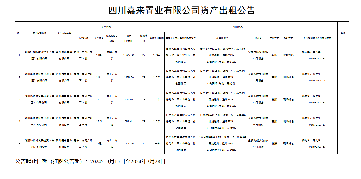 四川嘉來(lái)置業(yè)有限公司資產(chǎn)出租公告