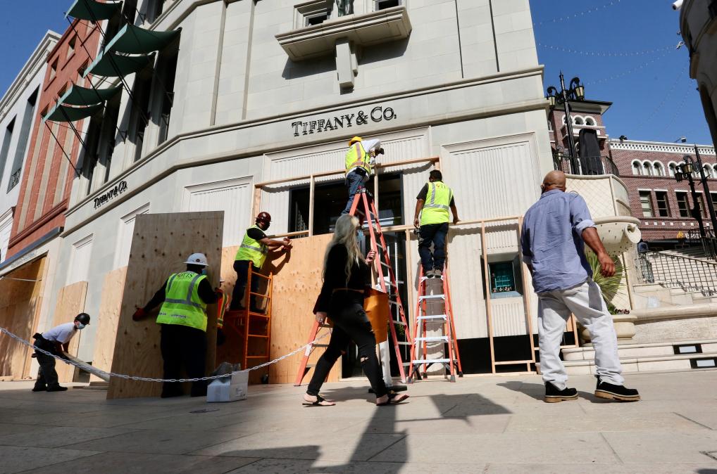 2020年11月2日,美國(guó)洛杉磯縣貝弗利山市商業(yè)區(qū)的商家將店鋪門窗封上。為應(yīng)對(duì)當(dāng)時(shí)美國(guó)大選可能出現(xiàn)的抗議或騷亂,貝弗利山市不少商業(yè)區(qū)加強(qiáng)防護(hù)和安保。 新華社發(fā)