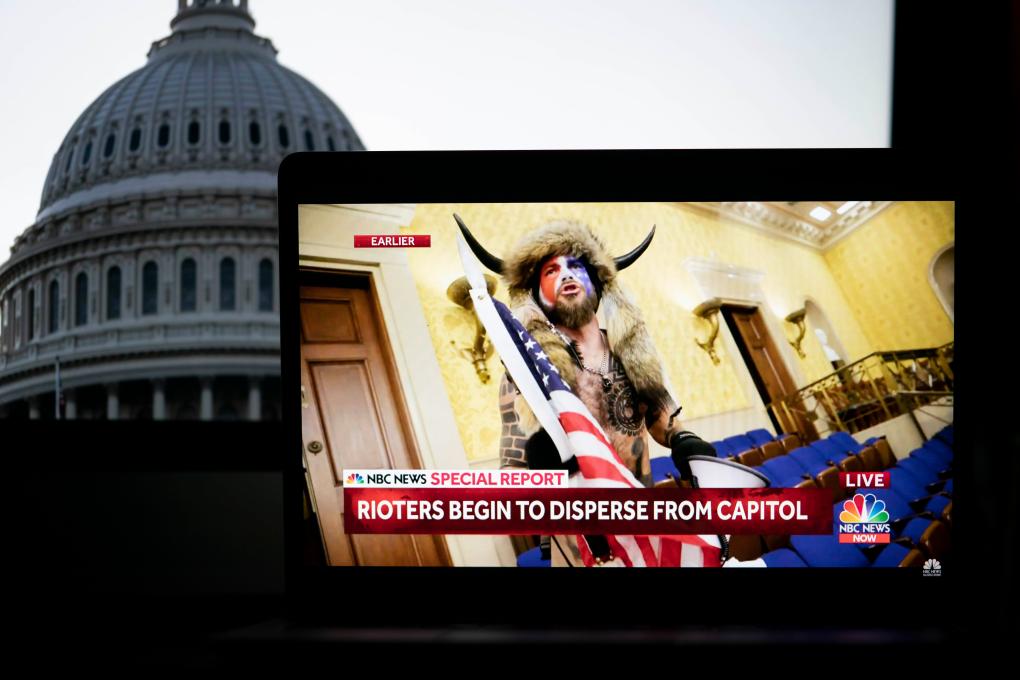 2021年1月6日拍攝的電視畫面顯示,一名抗議者闖入位于美國(guó)華盛頓的國(guó)會(huì)大廈。新華社記者劉杰攝