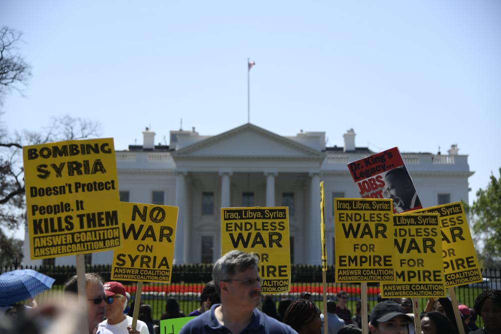 2018年4月14日,在美國(guó)華盛頓白宮北側(cè),人們手持標(biāo)語抗議對(duì)敘利亞進(jìn)行軍事打擊。新華社記者楊承霖?cái)z