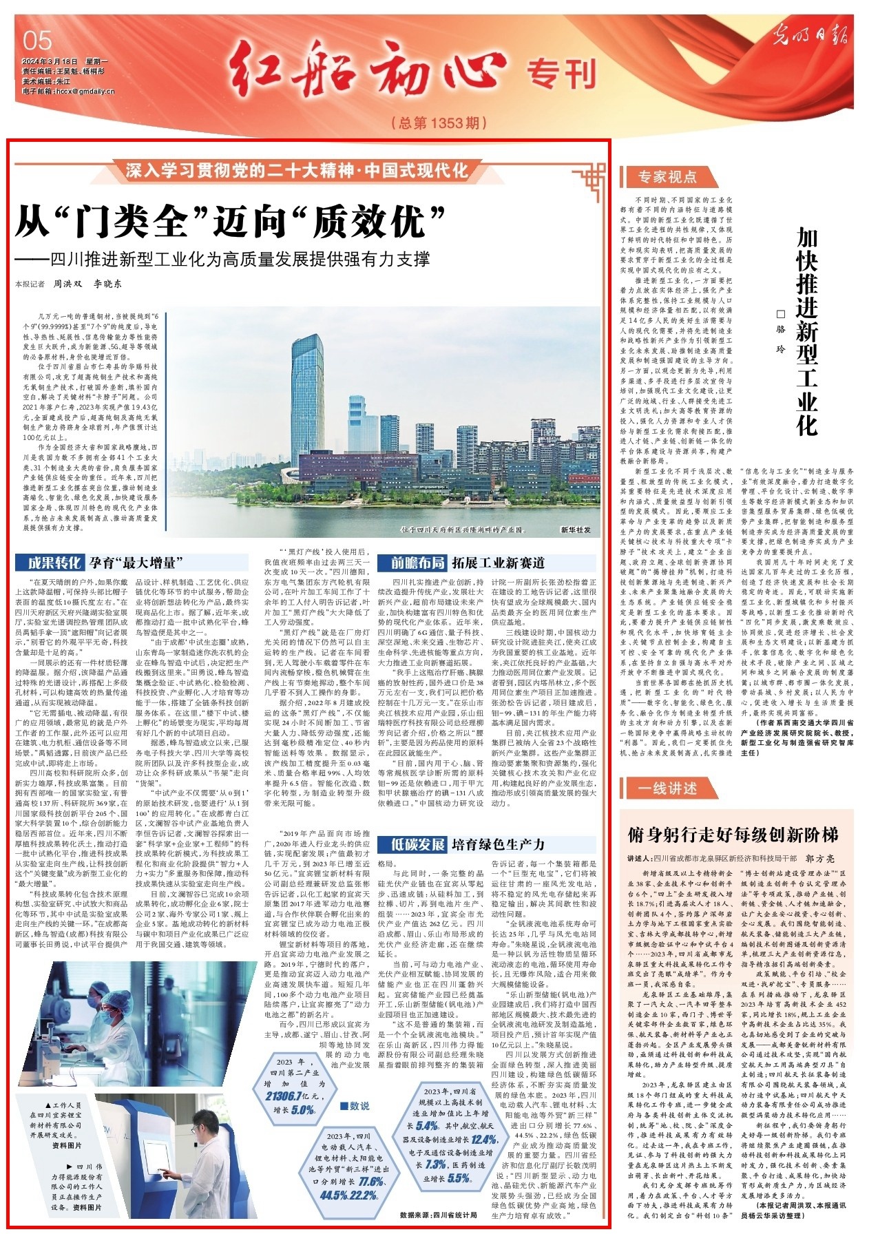 四川以發(fā)展方式創(chuàng)新推進(jìn)全面綠色轉(zhuǎn)型,深入推進(jìn)美麗四川建設(shè),構(gòu)建綠色低碳循環(huán)經(jīng)濟(jì)體系,不斷夯實(shí)高質(zhì)量發(fā)展的綠色本底。2023年,四川電動(dòng)載人汽車、鋰電材料、太陽能電池等外貿(mào)“新三樣”進(jìn)出口分別增長(zhǎng)77.6%、44.5%、22.2%,綠色低碳產(chǎn)業(yè)成為推動(dòng)高質(zhì)量發(fā)展的重要力量。四川省經(jīng)濟(jì)和信息化廳副廳長(zhǎng)敬茂明說:“四川新型顯示、動(dòng)力電池、晶硅光伏、新能源汽車產(chǎn)業(yè)發(fā)展勢(shì)頭強(qiáng)勁,已經(jīng)成為全國綠色低碳優(yōu)勢(shì)產(chǎn)業(yè)高地,綠色生產(chǎn)力培育卓有成效。”