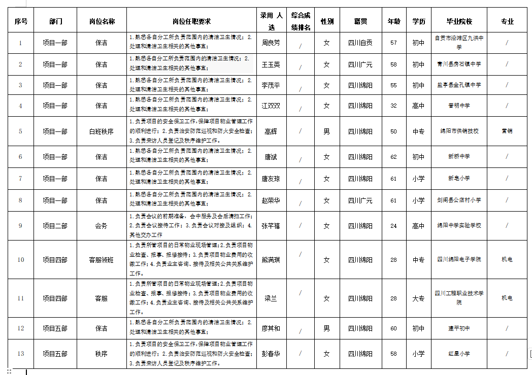 根據(jù)綿陽(yáng)市康來(lái)物業(yè)服務(wù)有限公司發(fā)布的招聘公告及招聘相關(guān)規(guī)定,經(jīng)面試、試用等程序,錄用以下人員到綿陽(yáng)市康來(lái)物業(yè)服務(wù)有限公司各項(xiàng)目部工作,現(xiàn)予以公示,具體情況如下: