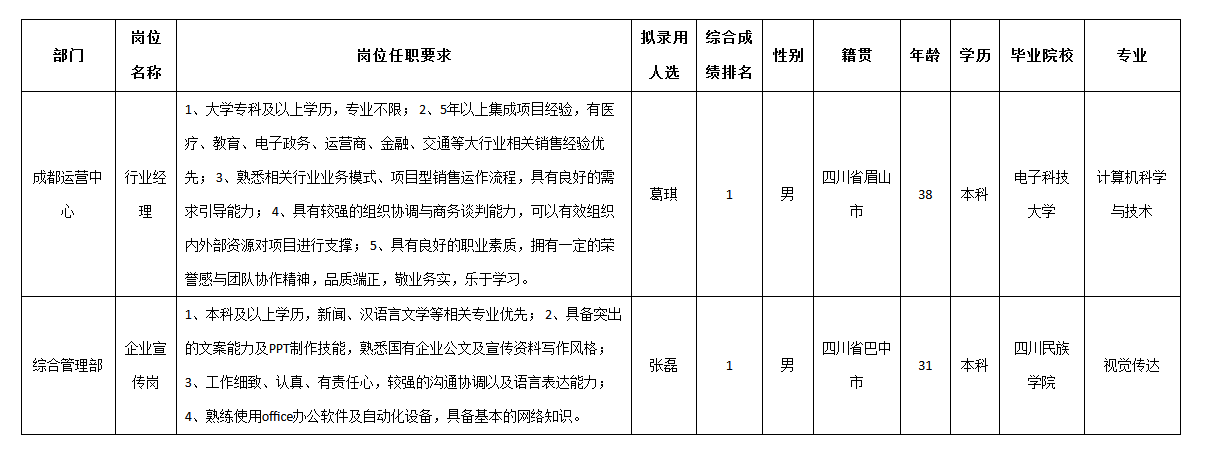 根據(jù)四川科瑞軟件有限責任公司發(fā)布的招聘公告及招聘相關(guān)規(guī)定,經(jīng)筆試、面試、考察、體檢等程序,擬錄用張磊,葛琪同志到四川科瑞軟件有限責任公司工作,現(xiàn)予以公示,具體情況如下: