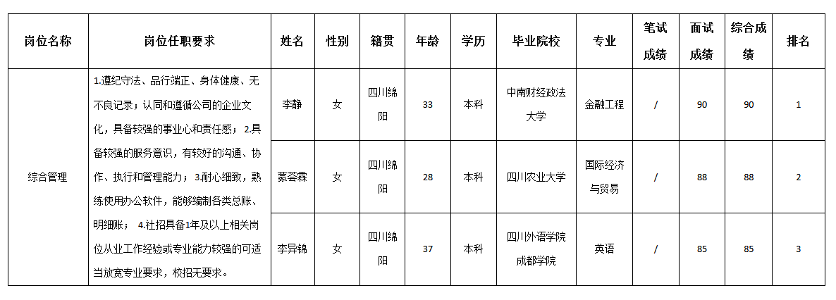 根據(jù)四川九強(qiáng)通信科技有限公司發(fā)布的招聘公告及招聘相關(guān)規(guī)定,經(jīng)筆試、面試等程序,現(xiàn)將筆試(面試)成績予以公示。