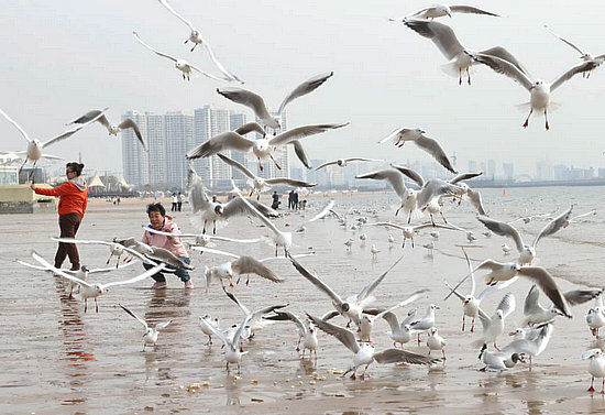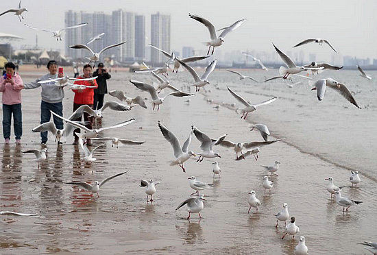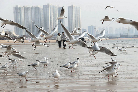 春日和暖,大批海鷗在河北省秦皇島市金夢(mèng)海灣浴場(chǎng)飛舞、覓食,吸引游客前來觀賞。