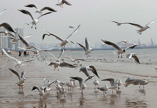 3月18日,海鷗在河北省秦皇島市金夢(mèng)海灣海邊覓食。