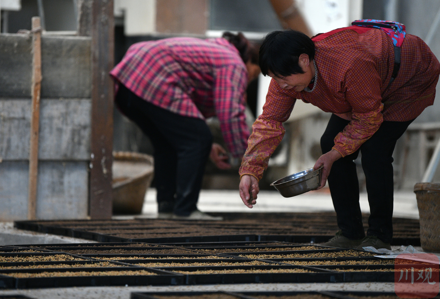 工人們正在育秧工廠播撒種子。