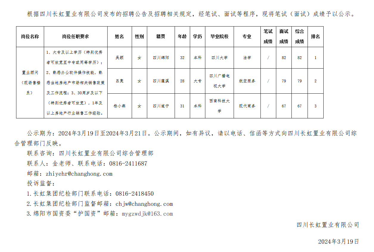 四川長虹置業(yè)有限公司關于招聘置業(yè)顧問(現(xiàn)場售樓員)成績的公示