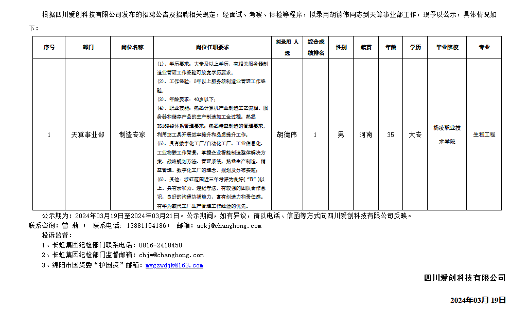 四川愛創(chuàng)科技有限公司關(guān)于招聘制造專家擬錄用人員的公示