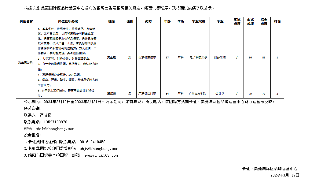 長(zhǎng)虹·美菱國(guó)際區(qū)品牌運(yùn)營(yíng)中心關(guān)于招聘資金兼分析崗成績(jī)的公示