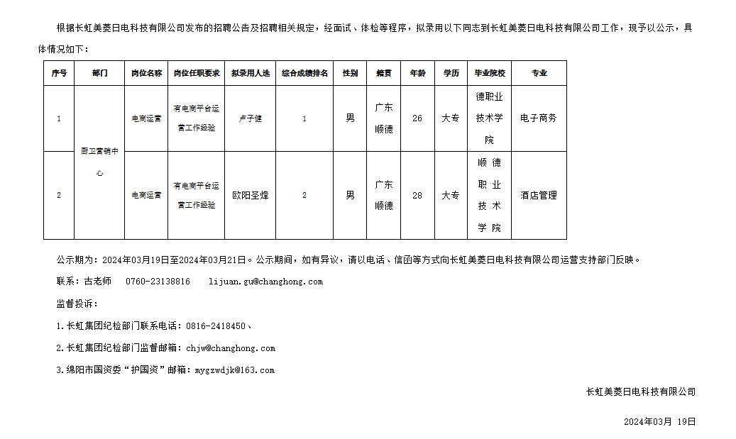 長虹美菱日電科技有限公司關(guān)于招聘電商運營崗擬錄用人員的公示