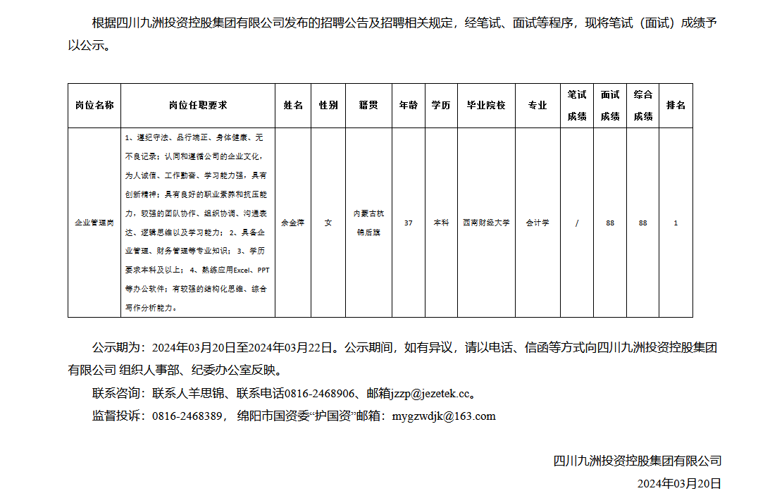 四川九洲投資控股集團有限公司關(guān)于招聘企業(yè)管理崗成績的公示