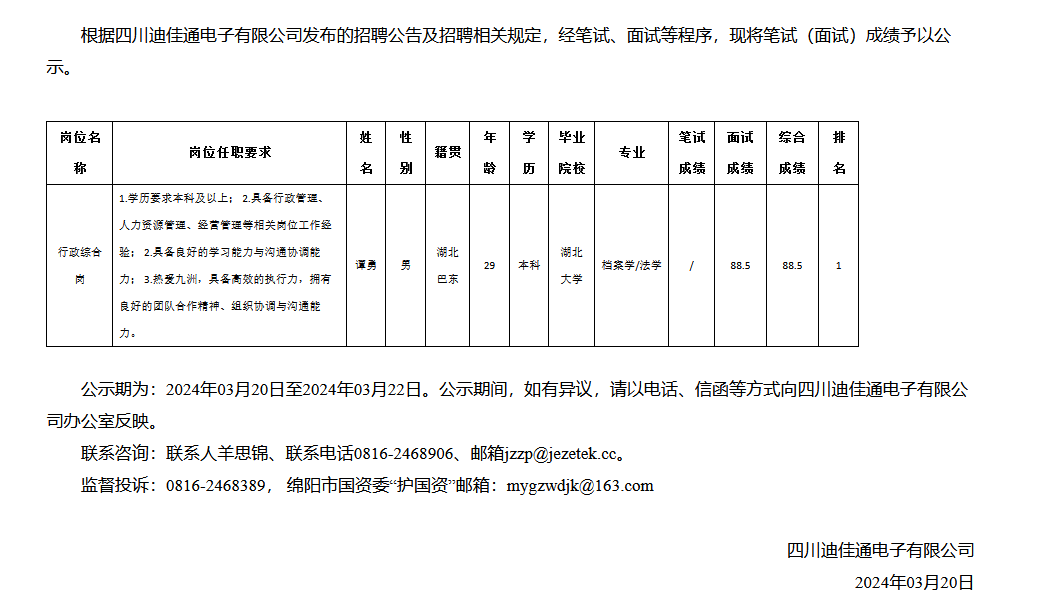 四川迪佳通電子有限公司關(guān)于招聘行政綜合崗成績的公示