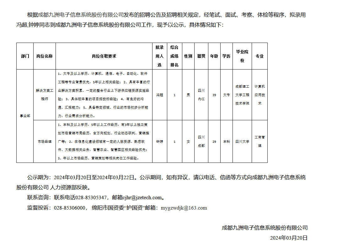 成都九洲電子信息系統(tǒng)股份有限公司關于招聘解決方案工程師等崗位擬錄用人員的公示