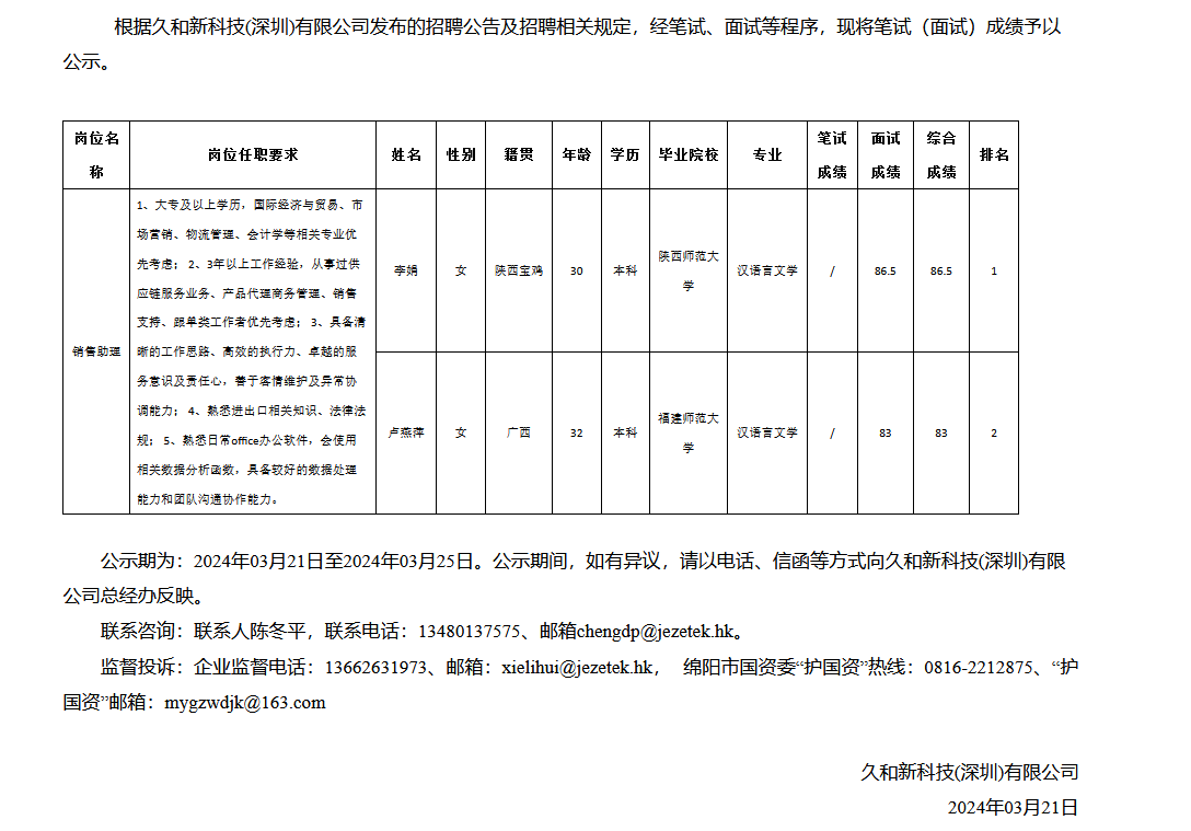 久和新科技(深圳)有限公司關(guān)于招聘銷售助理成績的公示