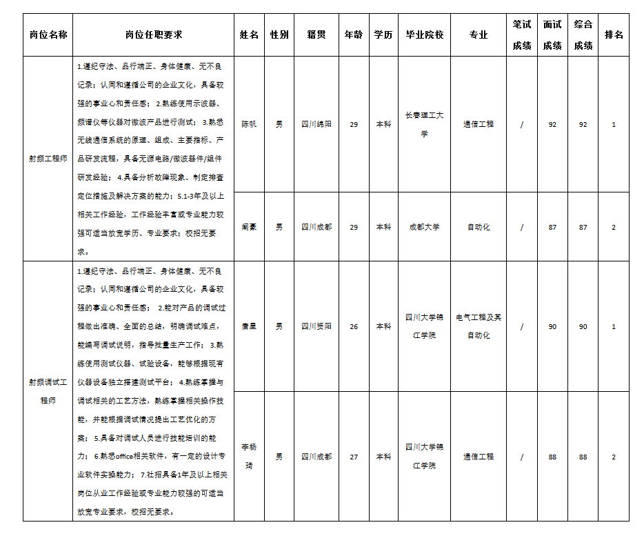 根據(jù)四川九強通信科技有限公司發(fā)布的招聘公告及招聘相關(guān)規(guī)定,經(jīng)筆試、面試等程序,現(xiàn)將筆試(面試)成績予以公示。