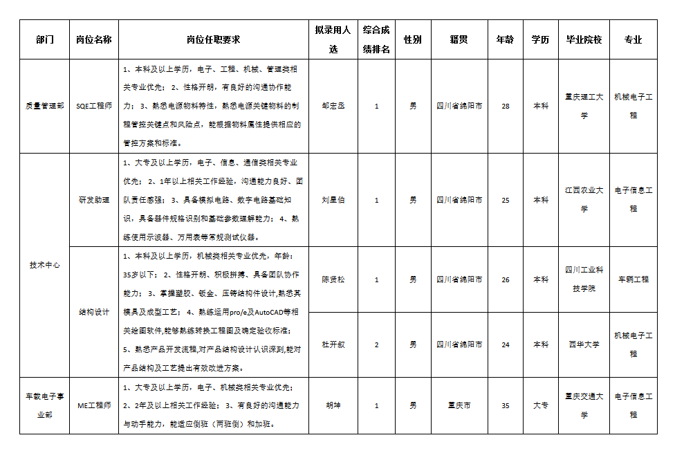 根據(jù)四川九州電子科技股份有限公司發(fā)布的招聘公告及招聘相關(guān)規(guī)定,經(jīng)筆試、面試、考察、體檢等程序,擬錄用胡坤,鄒宏丞,劉星伯,陳賢松,杜開敘同志到四川九州電子科技股份有限公司工作,現(xiàn)予以公示,具體情況如下: