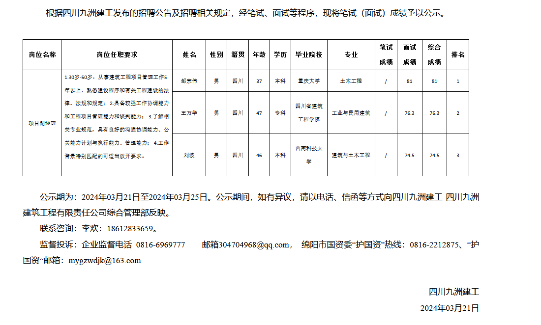 四川九洲建工關(guān)于招聘項(xiàng)目副經(jīng)理成績的公示