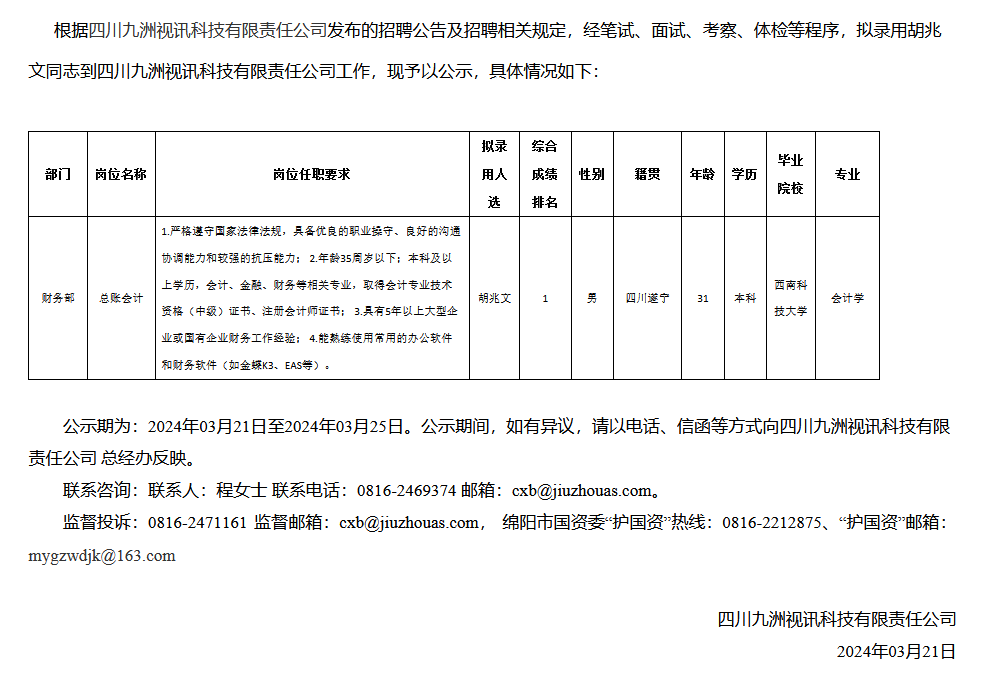 四川九洲視訊科技有限責(zé)任公司關(guān)于招聘總賬會計擬錄用人員的公示