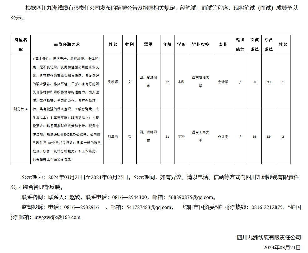 四川九洲線纜有限責(zé)任公司關(guān)于招聘財務(wù)管理崗成績的公示