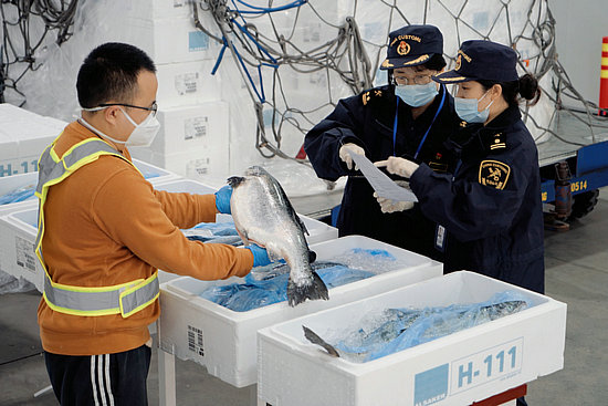 成都海關關員查驗進口三文魚(成都海關供圖)