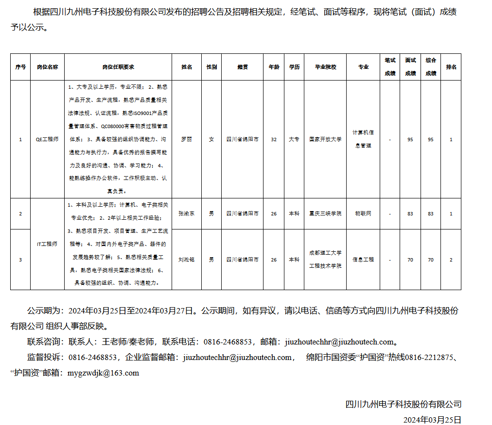 四川九州電子科技股份有限公司關(guān)于招聘IT工程師等崗位成績(jī)的公示