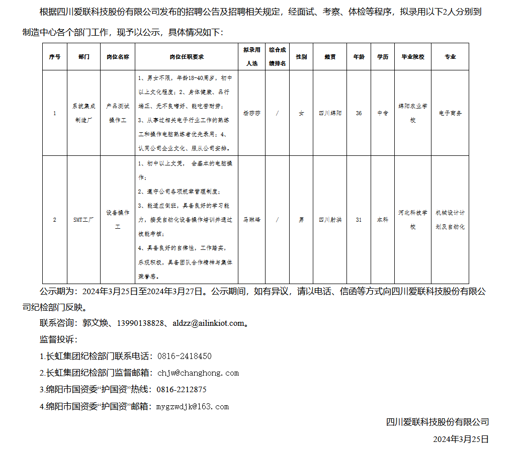 四川愛(ài)聯(lián)科技股份有限公司關(guān)于招聘產(chǎn)品測(cè)試操作工等崗位擬錄用人員的公示