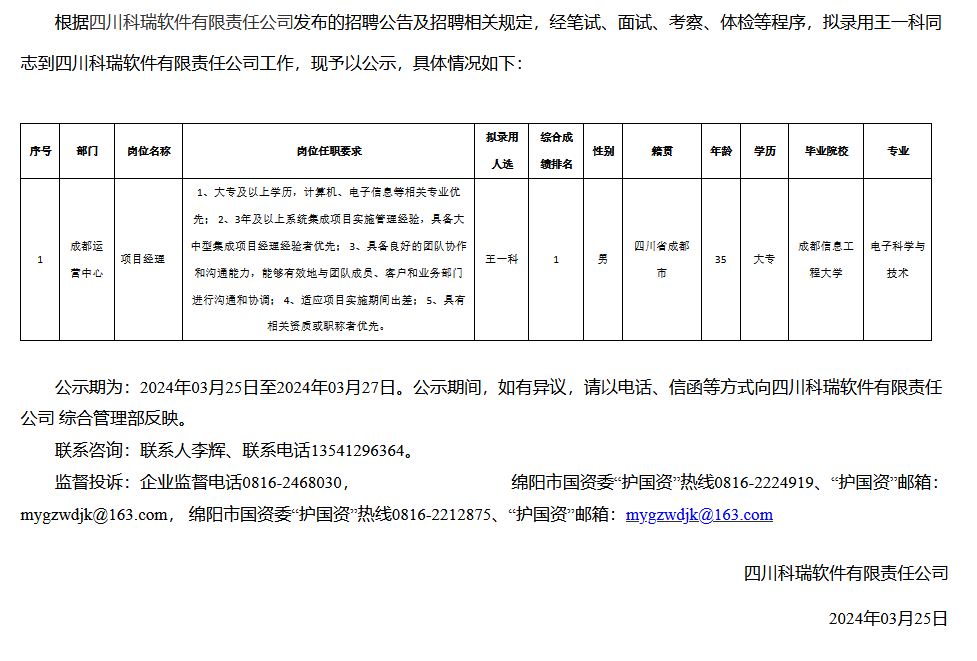 四川科瑞軟件有限責(zé)任公司關(guān)于招聘項目經(jīng)理崗擬錄用人員的公示