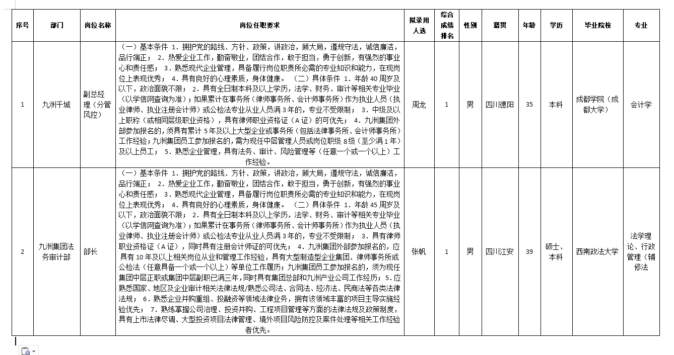 根據(jù)四川九州投資控股集團(tuán)有限公司發(fā)布的招聘公告及招聘相關(guān)規(guī)定,經(jīng)筆試、面試、考察、體檢等程序,擬錄用張帆,周龍同志到四川九州投資控股集團(tuán)有限公司工作,現(xiàn)予以公示,具體情況如下: