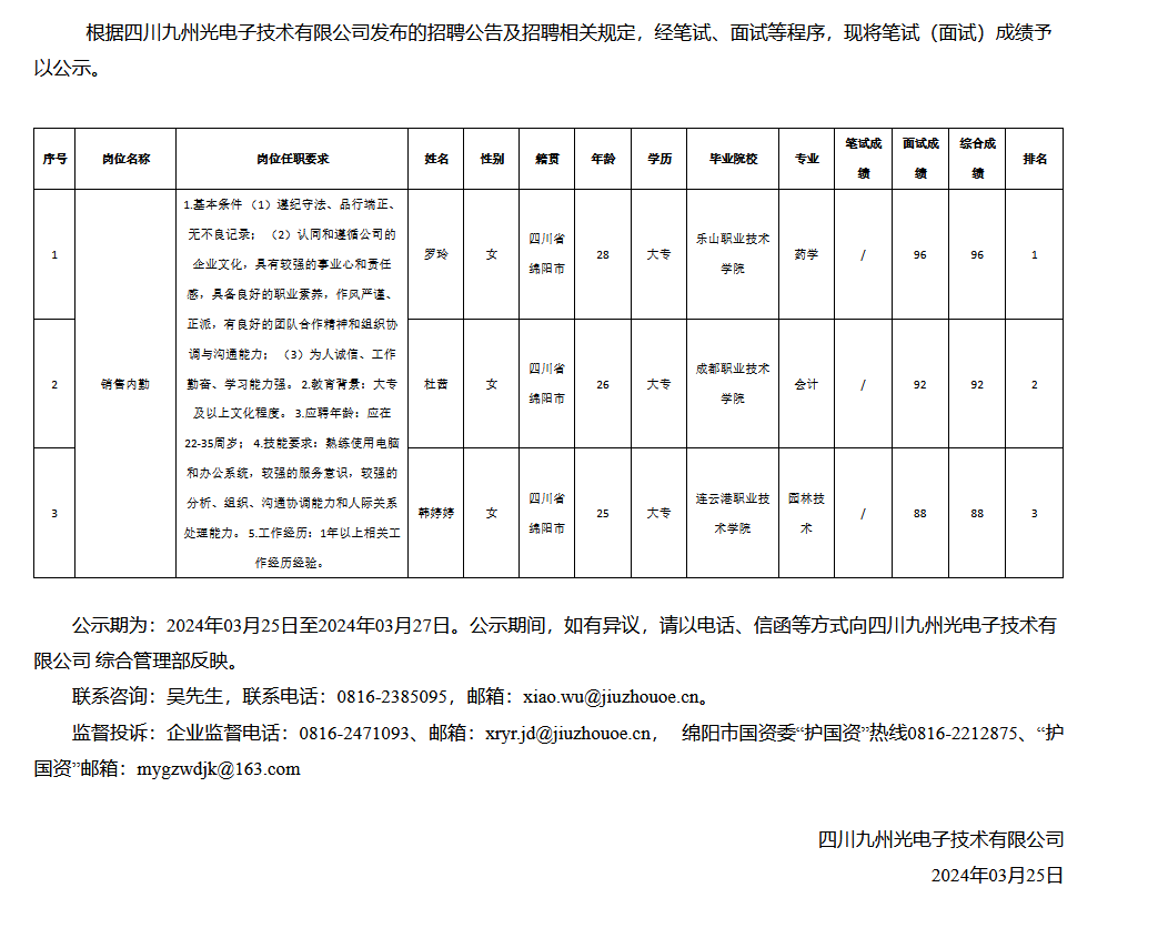 四川九州光電子技術(shù)有限公司關(guān)于招聘銷售內(nèi)勤崗位成績(jī)的公示