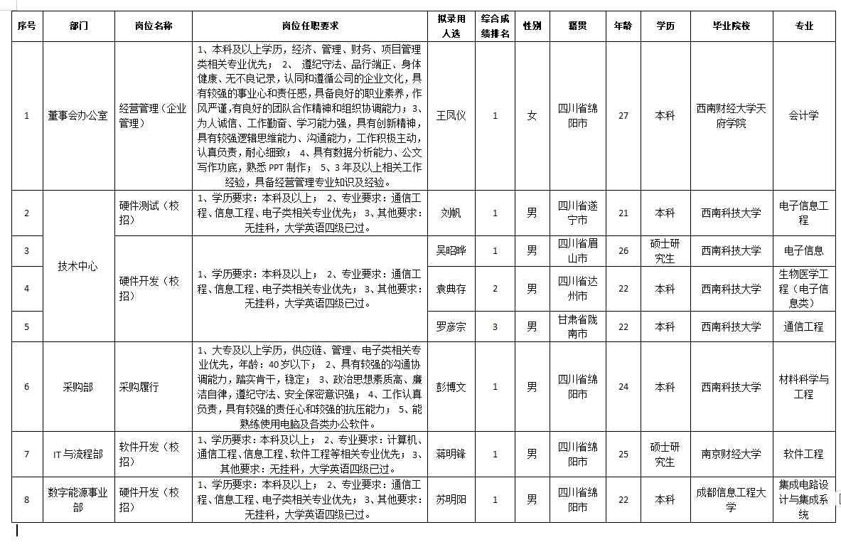 根據(jù)四川九州電子科技股份有限公司發(fā)布的招聘公告及招聘相關(guān)規(guī)定,經(jīng)筆試、面試、考察、體檢等程序,擬錄用王鳳儀,彭博文,吳昭曄,袁典存,羅彥宗,劉帆,蘇明陽(yáng),蔣明鋒同志到四川九州電子科技股份有限公司工作,現(xiàn)予以公示,具體情況如下: