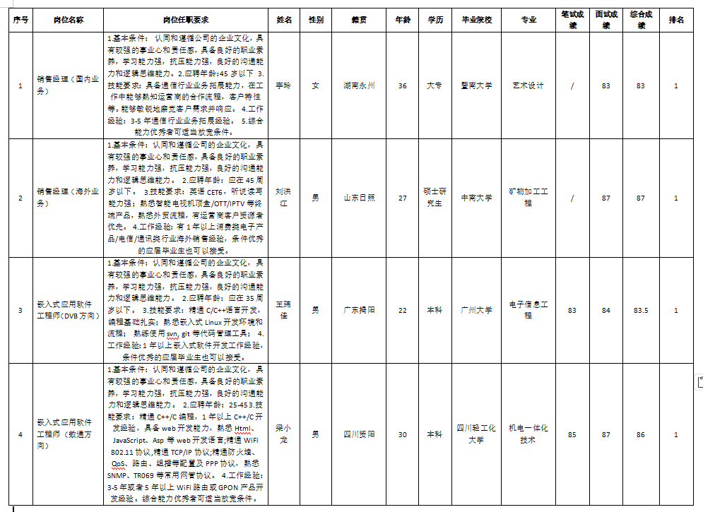 根據(jù)深圳市九州電器有限公司發(fā)布的招聘公告及招聘相關(guān)規(guī)定,經(jīng)筆試、面試等程序,現(xiàn)將筆試(面試)成績予以公示。