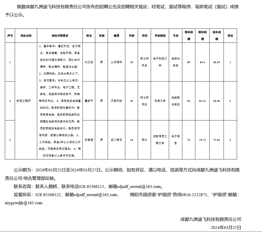 成都九洲迪飛科技有限責任公司關(guān)于招聘射頻工程師成績的公示