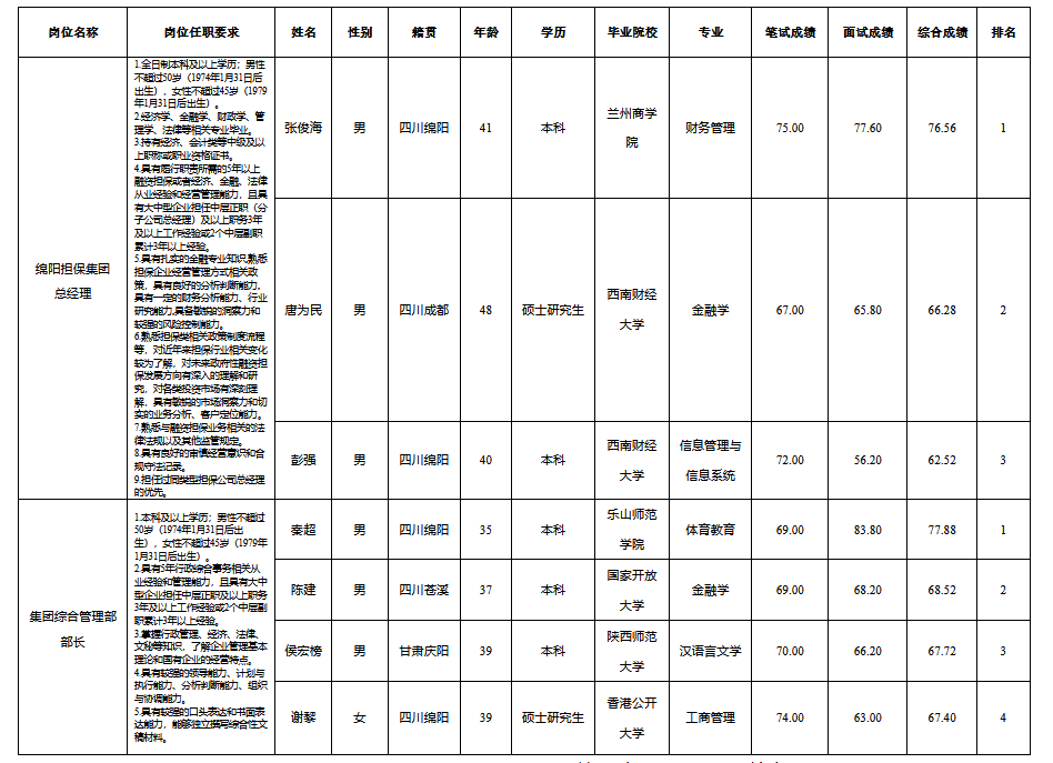 根據(jù)集團(tuán)發(fā)布的選聘公告及選聘相關(guān)規(guī)定,經(jīng)筆試、面試等程序,現(xiàn)將綜合成績(jī)予以公示。
