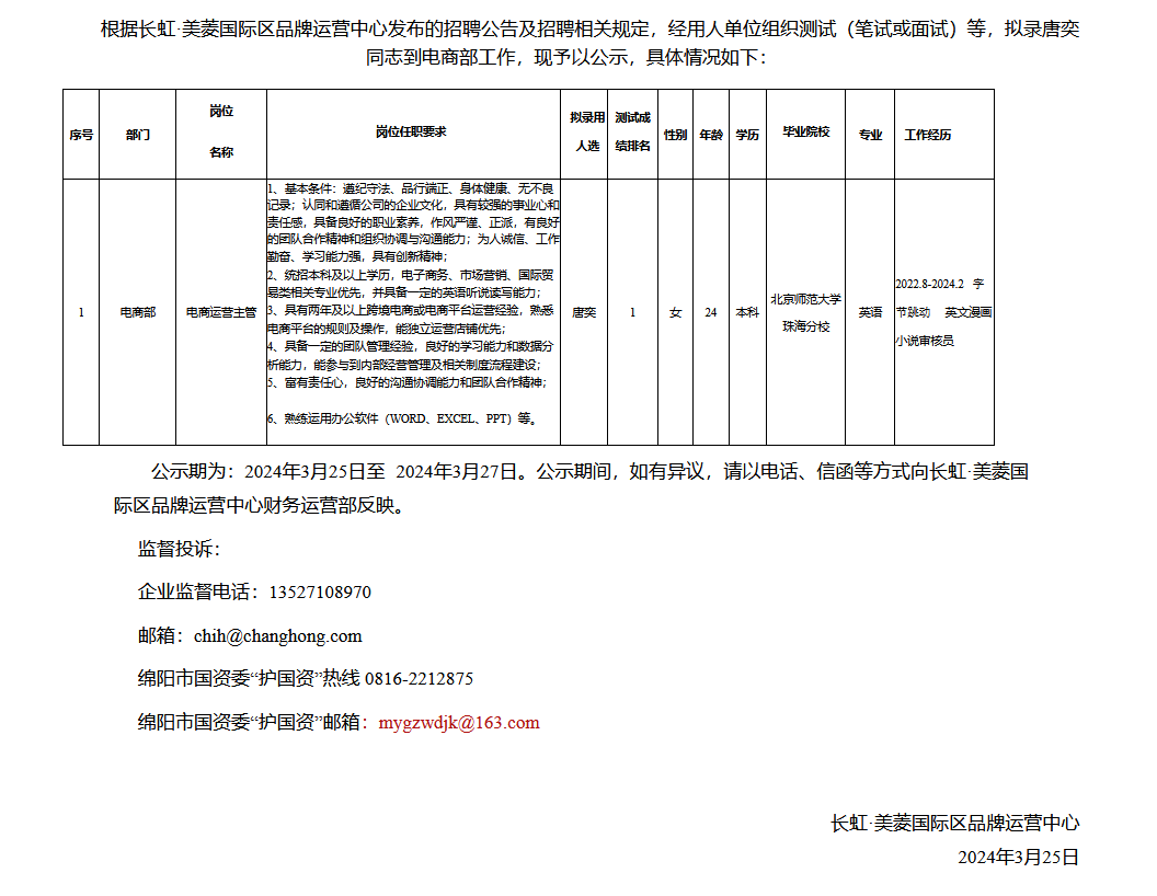 長虹·美菱國際區(qū)品牌運營中心關(guān)于招聘電商運營主管擬錄用人員的公示