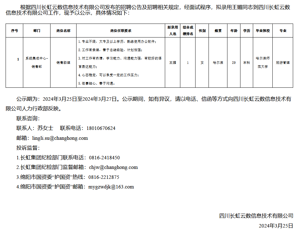 四川長(zhǎng)虹云數(shù)信息技術(shù)有限公司關(guān)于招聘銷售助理擬錄用人員的公示